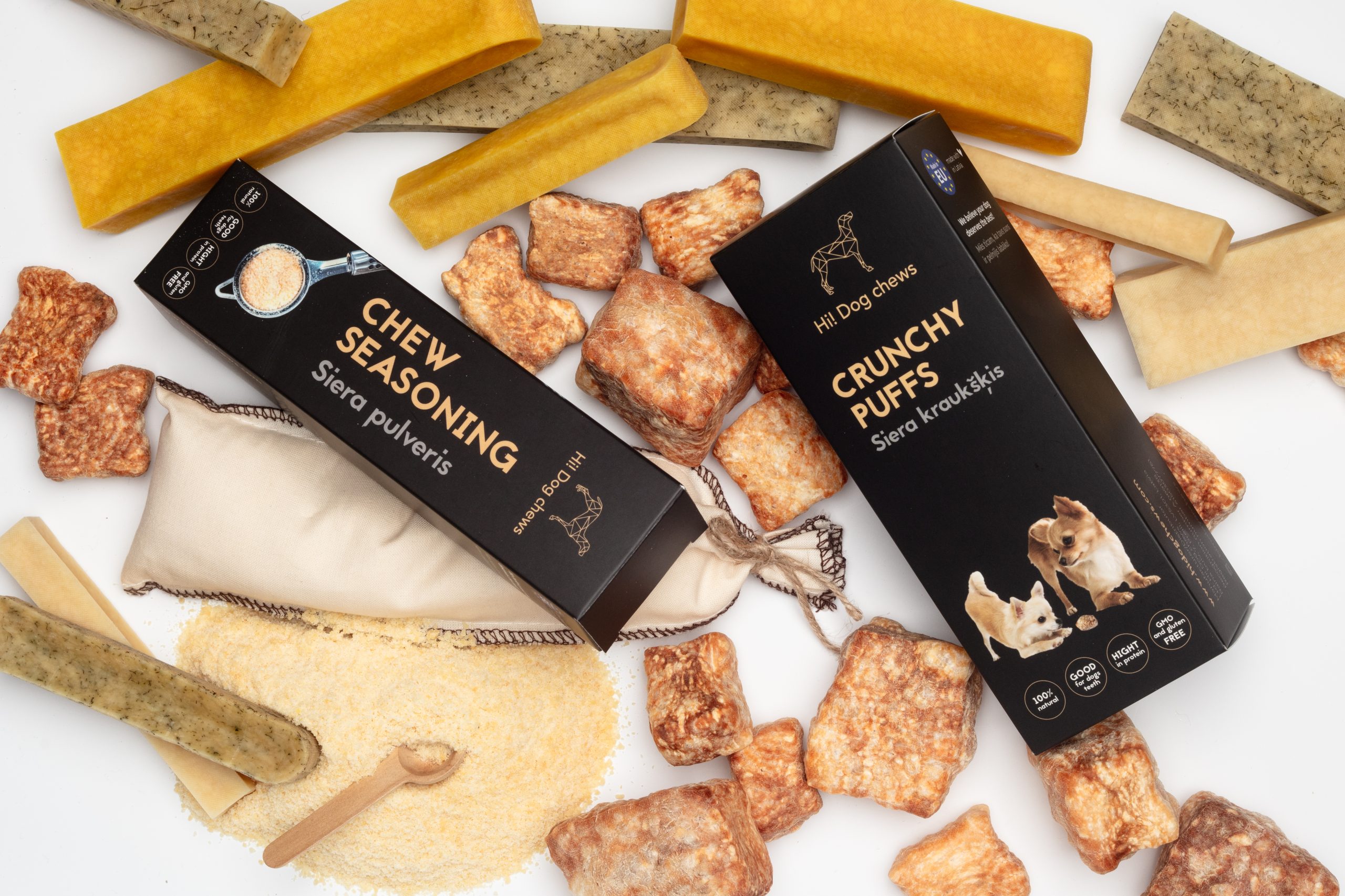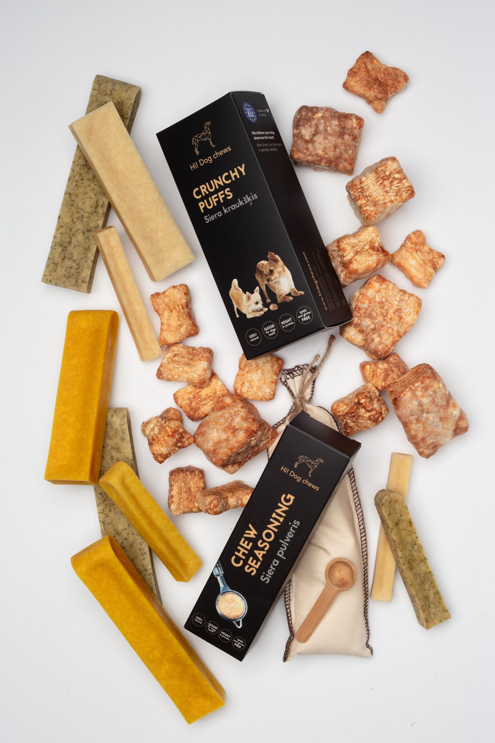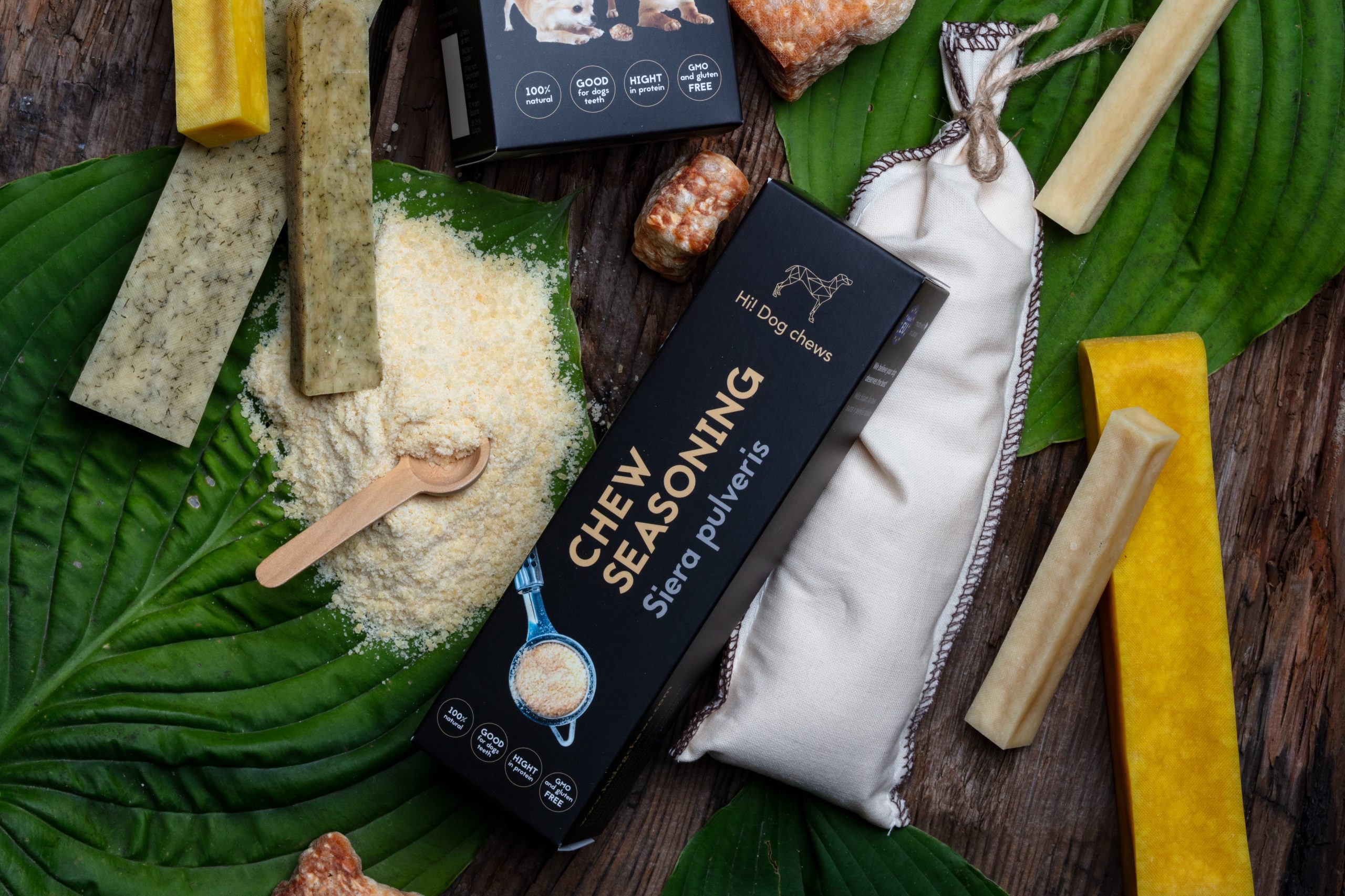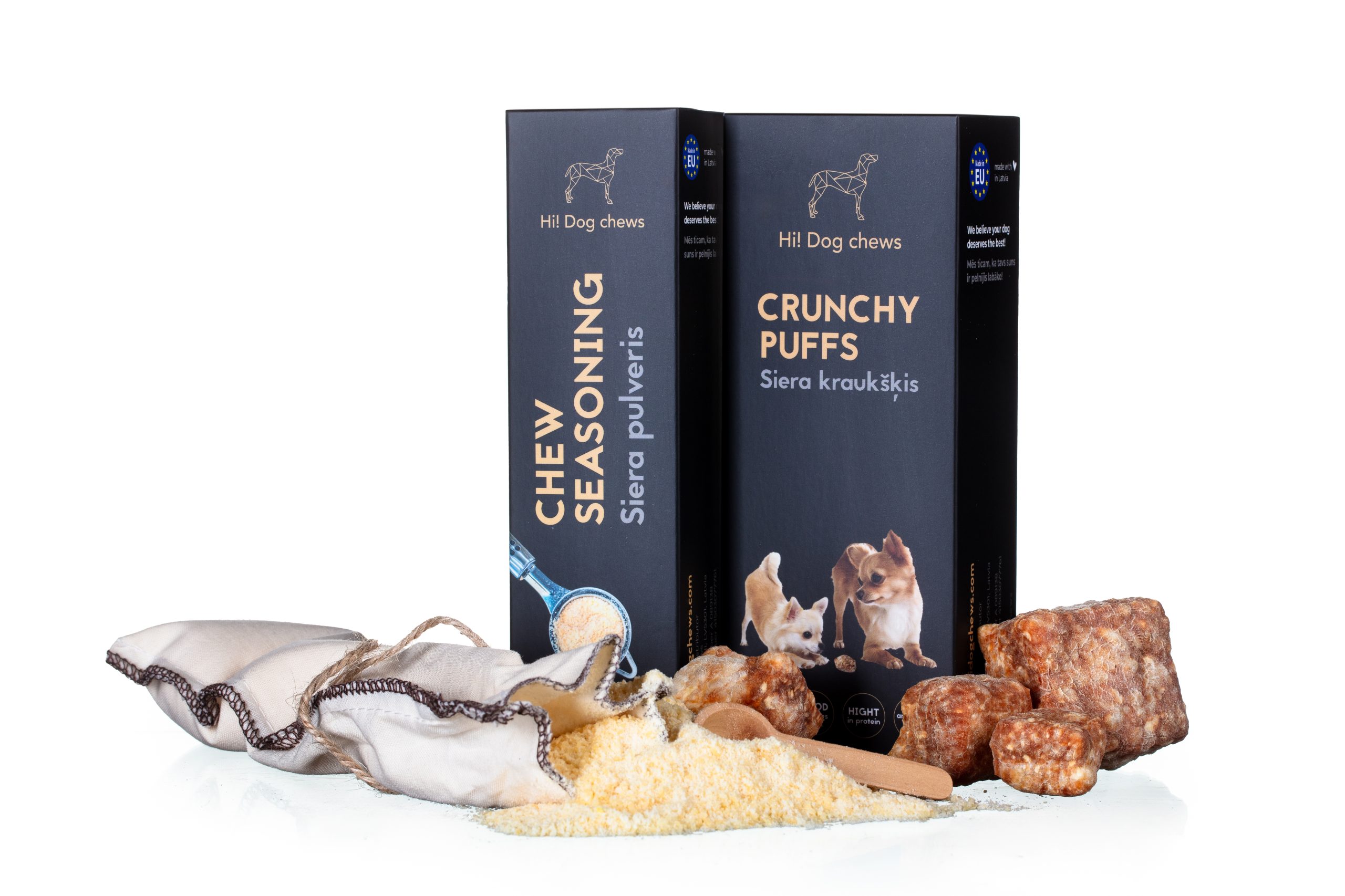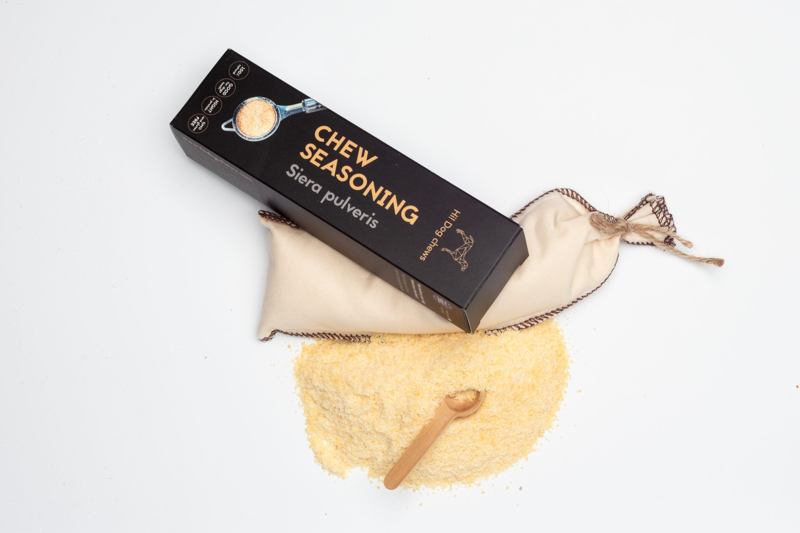 Dog chew seasoning is made from dried curd and is a healthy topping for all dogs in need of extra protein or to enhance food taste or smell. Specially recommended for lactacting dog moms and small puppies. Available plain or with added flax seeds fo an extra omega boost.