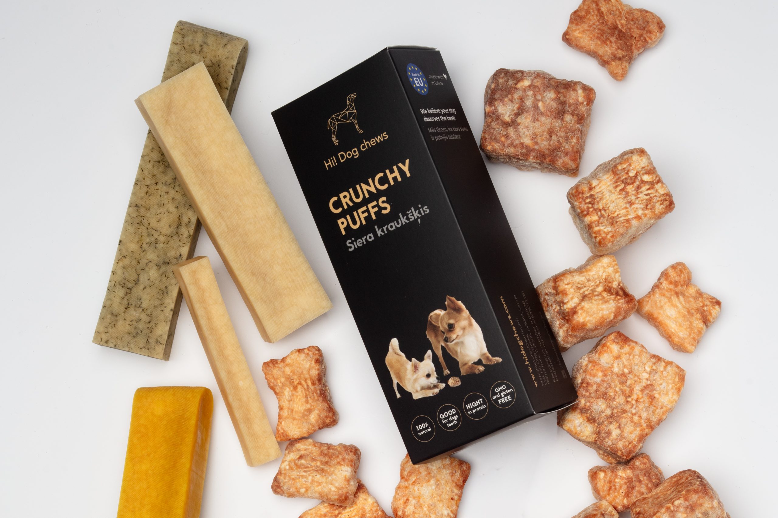 Dog chews are made from pure cow’s milk which goes through diligent pasteurization and coagulation processes. The final product is then dried for a minimum of 30 days to deliver our premium quality dog chews. Dog chews are available in four different sizes to fit all a dog’s chewing needs.